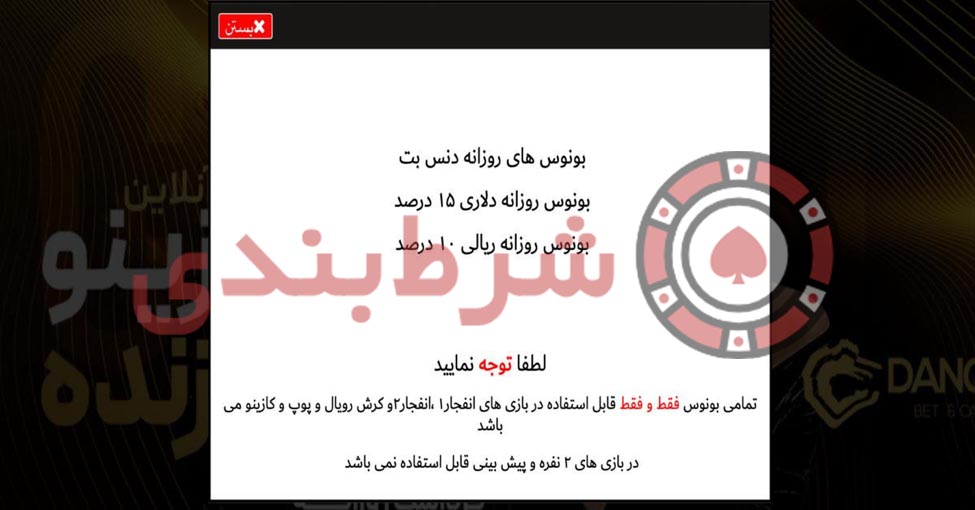 دنس بت بونوس‌های جذابی داره. شما می‌تونی از بونوس  روزانه دلاری ۱۵ درصد و بونوس روزانه ریالی ۱۰ درصد استفاده کنید. ما به شما پیشنهاد می کنیم شرایط بونوس‌ها رو قبل از فعال‌سازی بخونی.